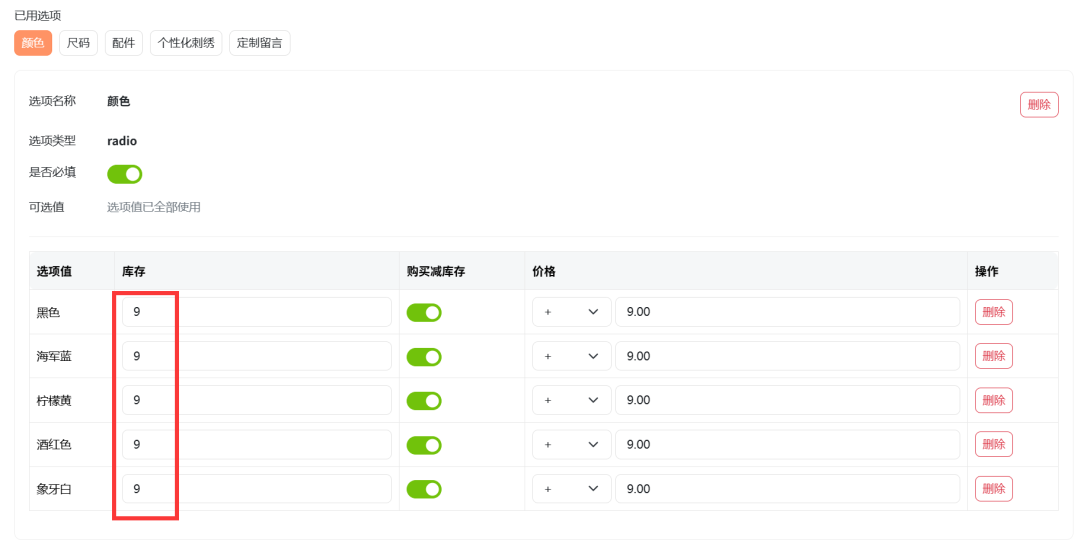 每件商品都能单独配置选项和库存,互不影响。