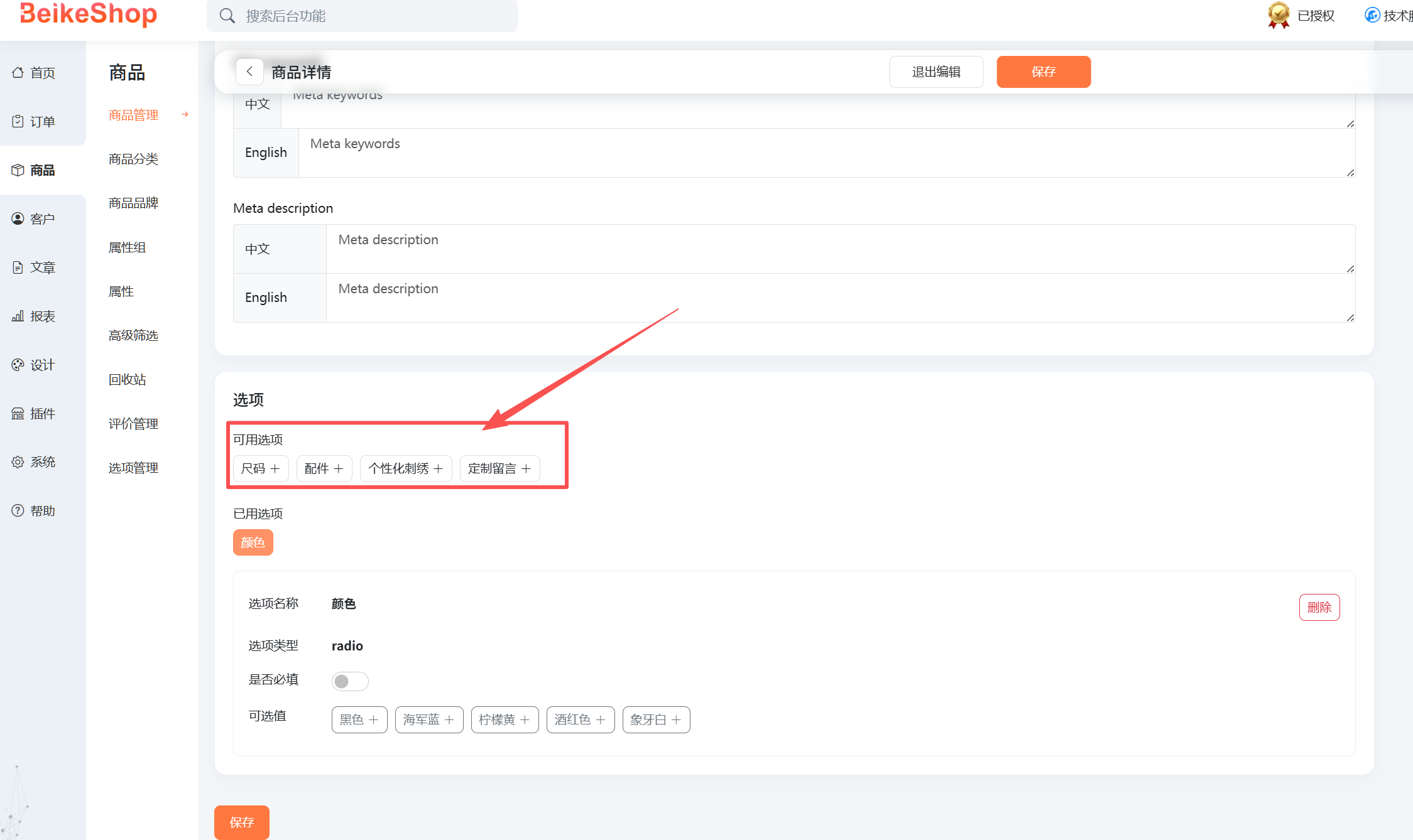 BeikeShop《商品自定义选项扩展插件》很好的解决了,卖家定制商品规格配置难的痛点,极大提升了用户体验。