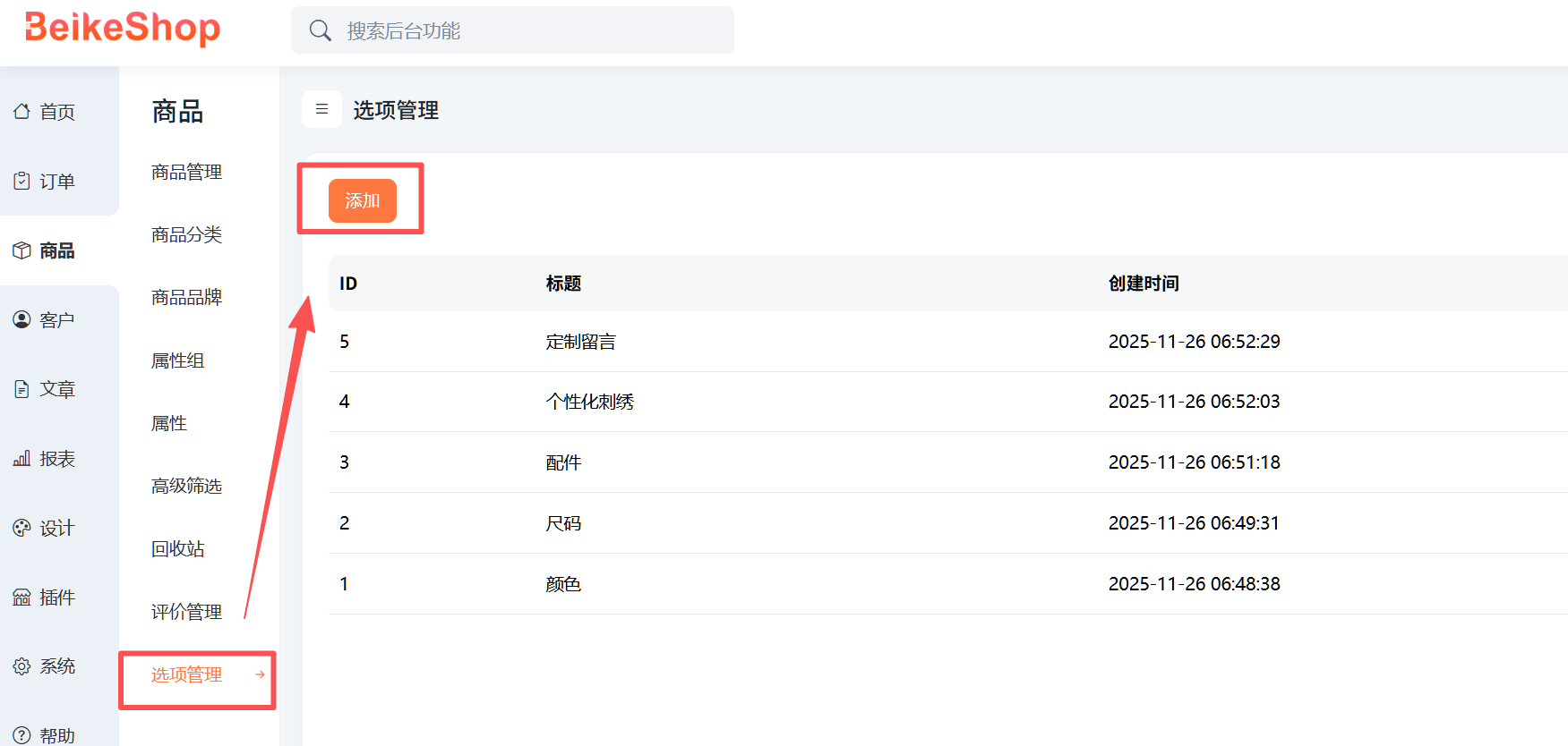 进入后台 →「商品 — 选项管理」→ 添加选项
